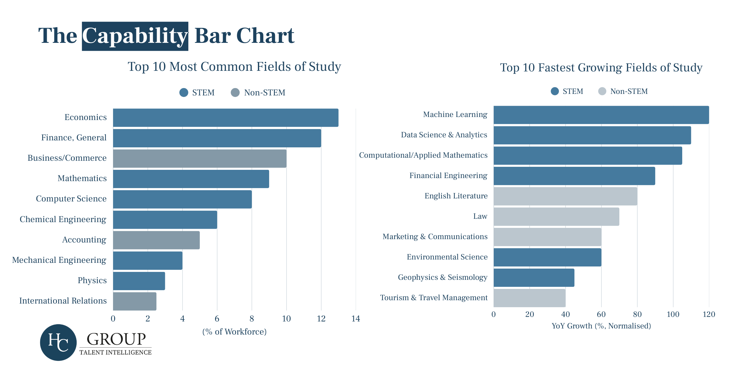 On one end, there is a clear push into deep technical expertise, with machine learning, data science, applied mathematics, and financial engineering among the fastest-growing fields of study. These hires are critical for powering advanced analytics, risk modelling, and systematic trading strategies.