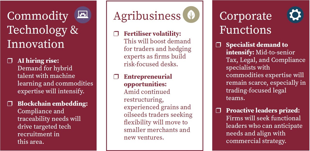 In 2026, commodities firms will compete for hybrid talent that can combine market knowledge with practical capability in AI, digital systems and transition‑related expertise. As trading models evolve and regulatory and sustainability pressures intensify, organisations that secure adaptable, tech‑literate specialists will be better placed to maintain resilience and capture new opportunities.